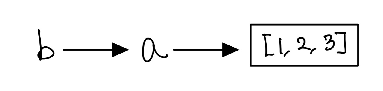 위와 같이 변수 b에 a가 가리키는 리스트를 대입했다. 그런 다음 a가 가리키는 리스트를 바꾸면 b 리스트도 똑같이 바뀐다. a, b 모두 같은 리스트인 [1, 2, 3]을 가리키고 있었기 때문이다. a, b는 이름만 다를 뿐이지 완전히 동일한 리스트를 가리키고 있는 변수이다. 아래 그림처럼 생각하면 이해하기 쉬울 것이다.